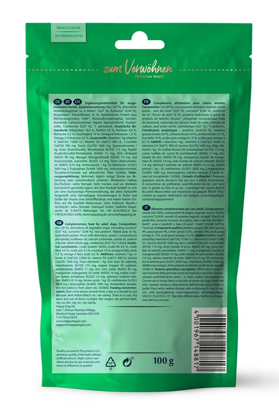 Soft-Snack Happy Dog India hjärtformade mjuka godis är perfekt för din fyrbenta vän som belöning eller mellanmål. Högsmält ris och ärtor i kombination med de välgörande egenskaperna hos tranbär, kokos och gurkmeja är en smakupplevelse för kräsna gourmeter. Det vegetariska godiset är också idealiskt för känsliga och krävande hundar av medelstor och stor storlek och rekommenderas av veterinärer vid födoämnesintolerans. Självklart tillverkas snacksen utan tillsats av socker eller konserveringsmedel och har en återförslutning som garanterar långvarig färskhet. En trevlig stund av njutning är garanterad!