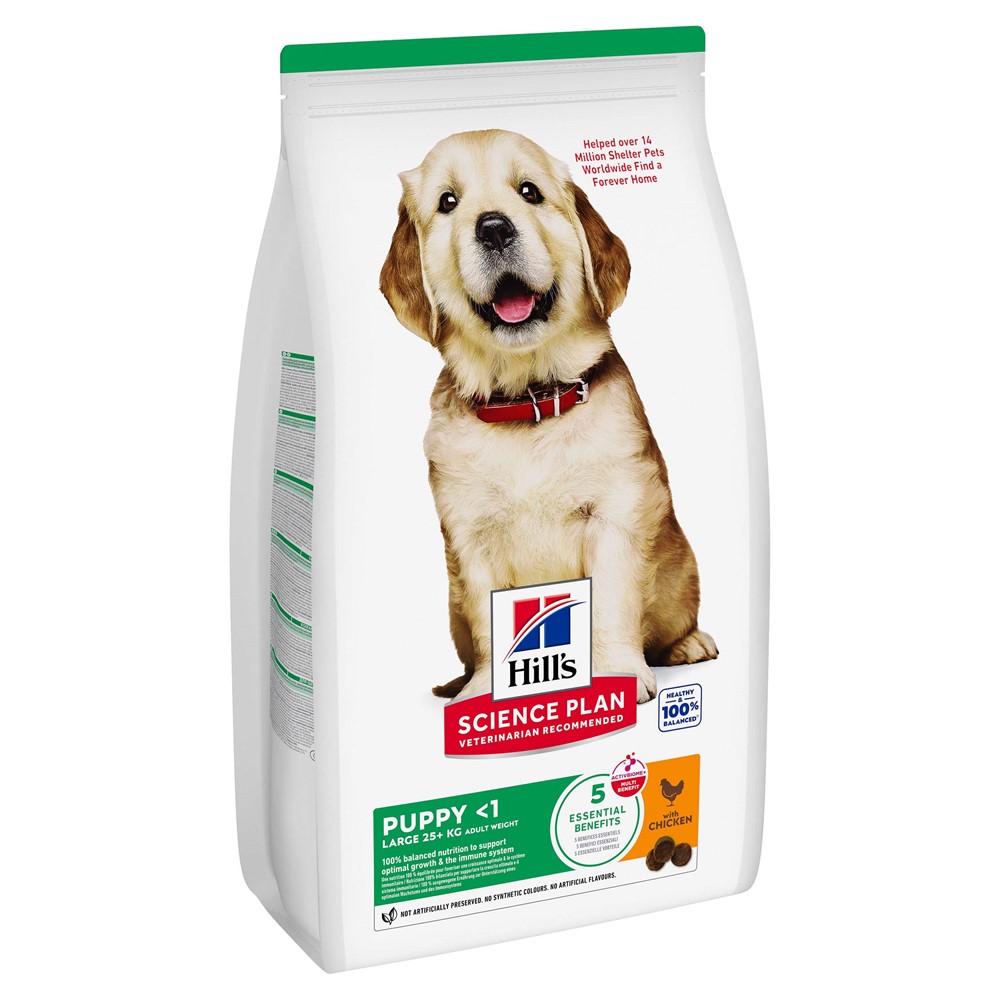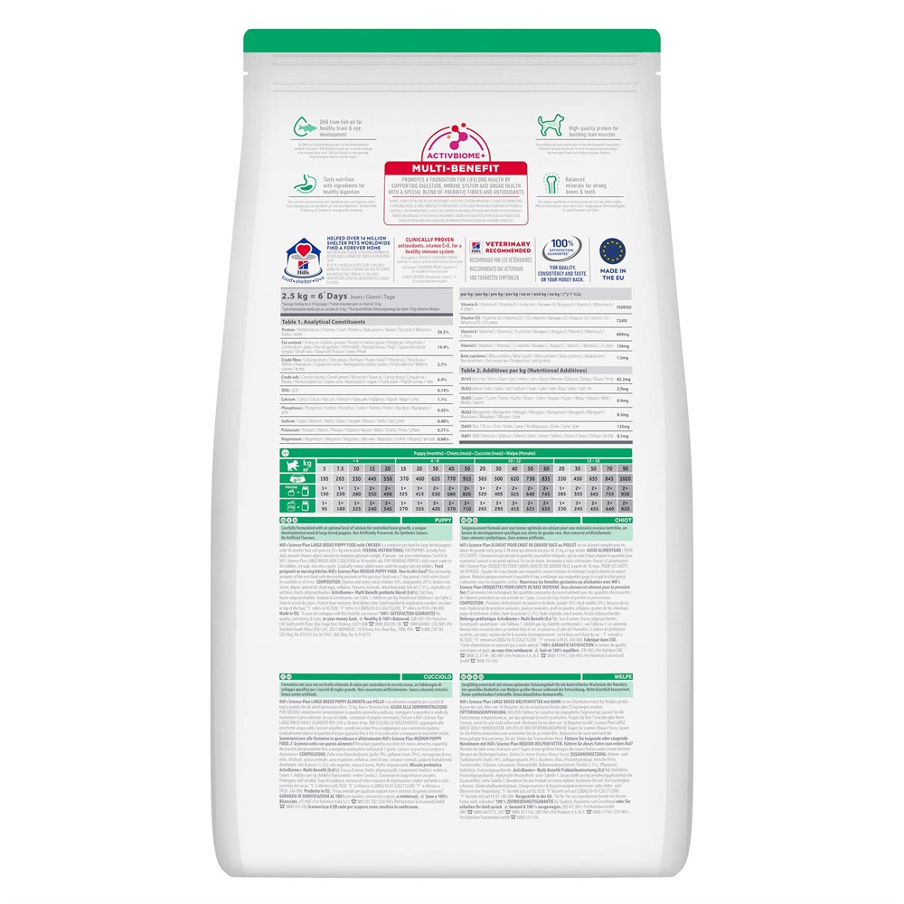 Att hitta ett foder med rätt näringsämnen som hjälper din valp att växa och utvecklas optimalt behöver inte vara svårt. Därför består Hill's Science Plan Large Breed Puppy torrfoder med kyckling av utsökt, 100 % hälsosam och balanserad nutrition som främjar din valps optimala tillväxt. Denna näring är noggrant sammansatt med en optimal halt av kalcium för kontrollerad bentillväxt, vilket är ett unikt utvecklingsbehov hos valpar från stora hundraser. För en sund utveckling av hjärnan och ögonen innehåller fodret DHA från fiskolja och högkvalitativt protein för att bygga upp smidig muskulatur. Detta välsmakande foder innehåller även ingredienser som främjar en sund matsmältning. För din hunds allmänna välbefinnande och matsmältningshälsa är denna näring sammansatt med ActivBiome+ Teknologi, en egenutvecklad blandning av prebiotika som ger näring åt hundens mikrobiom.