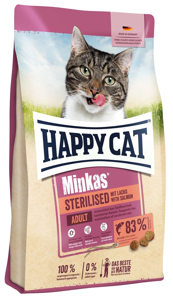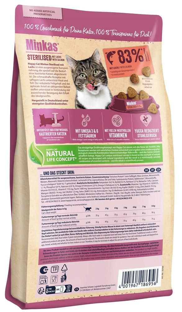 Happy Cat Minkas Sterilised med lax är ett bra torrfoder som är särskilt anpassat till behoven hos kastrerade katter med reducerat energibehov. Eftersom ämnesomsättningen hos steriliserade katter och kastrerade hankatter förändras och då de dessutom oftast rör sig mindre efter kastreringen än tidigare, rekommenderar vi att man håller koll på vikten hos kastrerade katter. I regel behöver kastrerade katter mindre energi än okastrerade katter. Därför är Happy Cat Minkas Sterilised med lax optimalt för kastrerade djur. Ett reducerat fettinnehåll i kombination med tillsats av mättande kostfiber bidrar nämligen till att din katt blir mätt, med full smak men mindre fett. På så sätt kan detta kattfoder effektivt bidra till viktkontroll och hjälpa till att bibehålla din katts idealvikt – särskilt vid mindre aktivitet efter kastreringen.