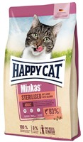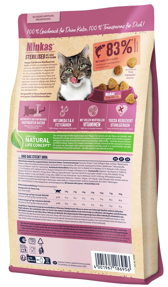 Den noggrant avvägda recepturen med läcker lax förser din katt med värdefulla omega-3- och omega-6-fettsyror för en frisk hud och en glänsande päls. Den innehåller yucca-växt som till och med kan bidra till att minska avföringens lukt. Förutom den utmärkta smaken erbjuder Happy Cat Minkas Sterilised alla viktiga näringsämnen som din katt behöver för ett vitalt liv som kastrerad. De noggrant sammansatta Happy Cat Minkas-recepten är naturligtvis fria från artificiella smakämnen och konserveringsmedel.