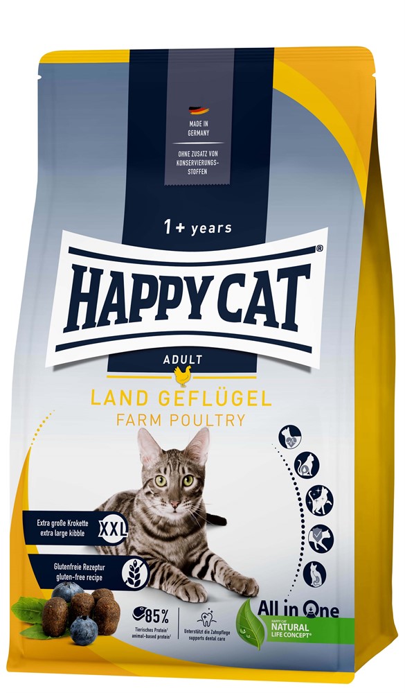Denna särskilt näringsrika och läckra sammansättning med kött från frigående fågel, saftiga blåbär och smakrik maskros ger den perfekta grunden för ett långt och hälsosamt liv. Grönläppad mussla från Nya Zeeland stöder lederna. De extra stora kroketterna ger mer variation i skålen; de stimulerar också till intensiv tuggning och främjar därigenom tandvården. Den välsmakande kompositionen är också lämplig för kräsna katter.