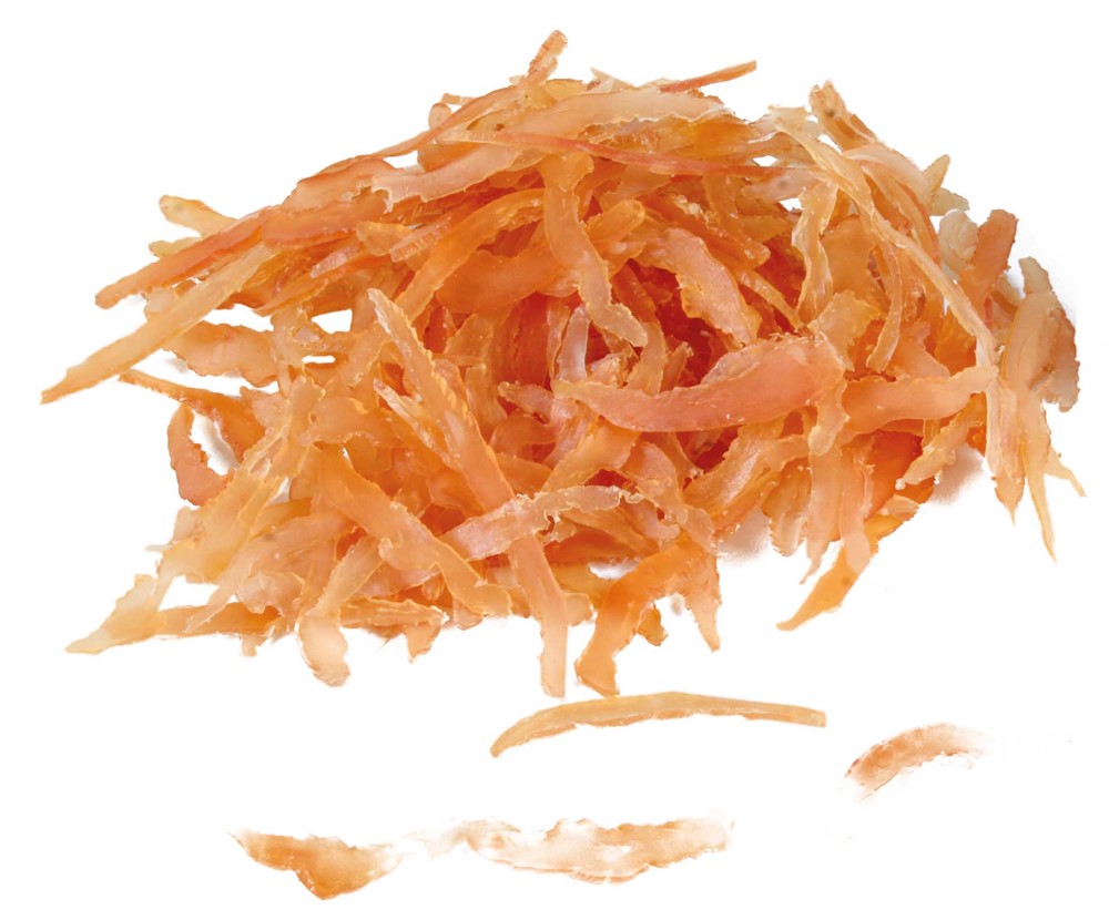Sammansättning: kycklingkött (72 %), vit fisk (10 %), sojaprotein, glycerin, sorbitol, mineraler | glutenfritt | utan tillsatt socker | Förvaras svalt och torrt.