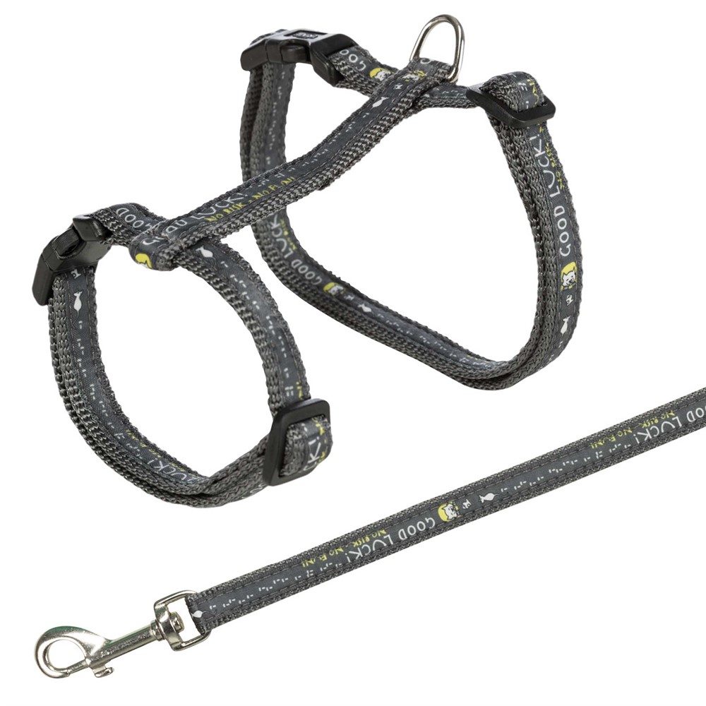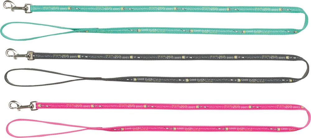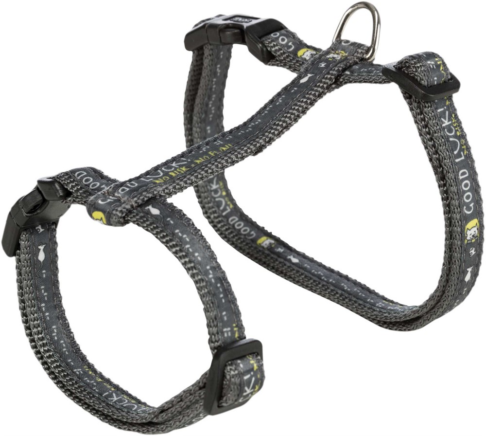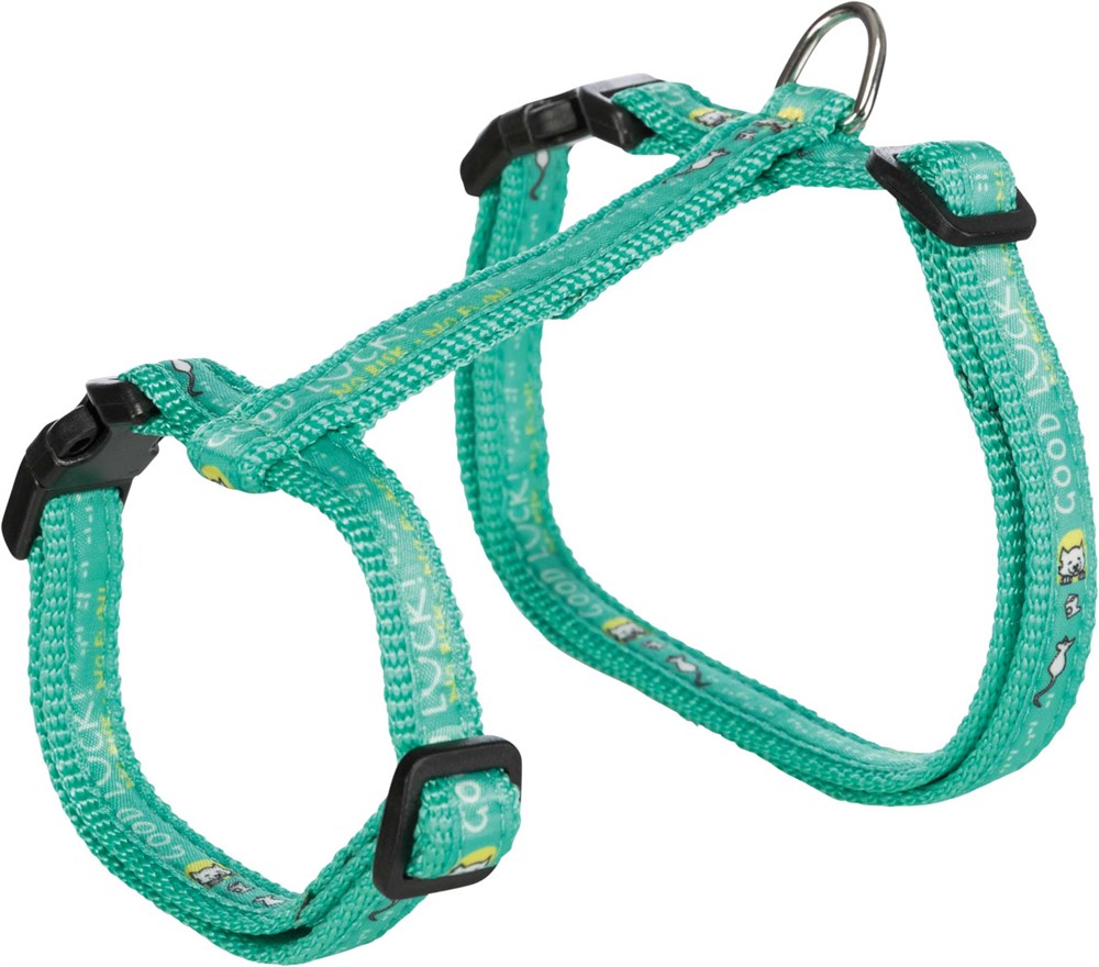 Sele med koppel ger en bekväm och säker passform för större katter och små hundar. Det steglöst justerbara vävbandet anpassas enkelt efter kroppen och ger fin rörelsefrihet. Snäppspännen gör selen smidig att ta på och av, och det 1,20 m långa kopplet ger trygg kontroll. Den lekfulla “Good Luck”-designen sätter en glad och personlig prägel på varje promenad.